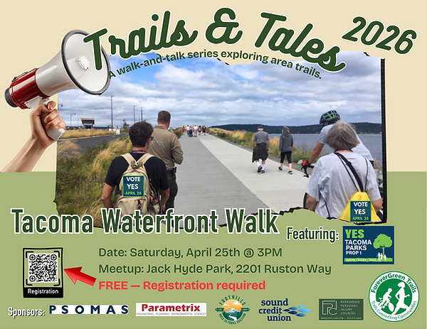 Trails & Tales brings Pierce County’s trails to life through immersive stories, local culture, and community connection. Each event highlights the landscapes and voices that make our region unique—while showcasing ForeverGreen Trails’ work to protect, connect, and expand the trail network. Explore the trail, discover the story, and support a healthier, more connected Pierce County.